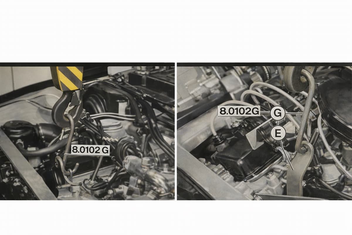-Enganchar el motor a la trócola por medio del gancho corto G y del gancho E (106) o del gancho G solo (829).